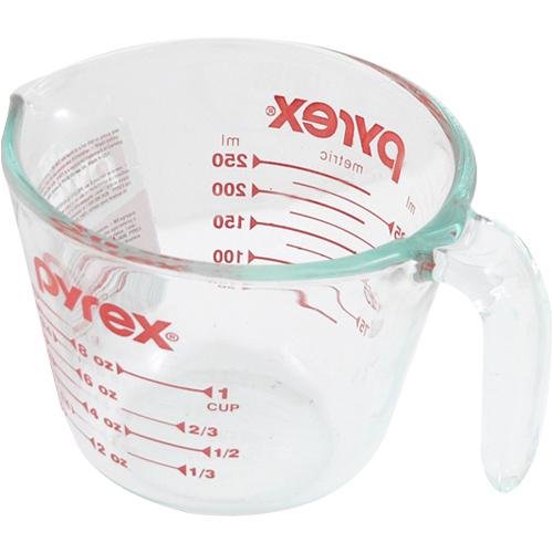 Pyrex Prepware 1-cup measuring cup includes 1-each 1-cup measuring cup with red graphics. Whether you are preparing a multi-course meal or simply a snack for one, Pyrex offers products which make food preparation a little easier, from beginning to end. There's no substitute for Pyrex, the original glass bakeware. Introduced 90 years ago and made of a durable, high temperature material, Pyrex remains the ideal medium for safe, dependable food preparation.