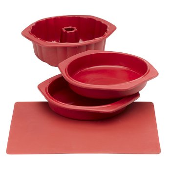 Let your sweet tooth dominate with the Cake Baking Set in red. Made from premium quality silicone, these products provide ample flexibility and a nonstick, easy-to-clean finish. Make tons of goodies with the included fluted cake pan, 2 round cake pans and 1 baking sheet. Silicone bakeware retains its shape during and after cooking. It is hygienic and completely food safe—it will not absorb odors or flavors. Set features textured surfaces that aid in gripping for better handling, heat resistance up to 500° F and is microwave and freezer safe. This FDA-approved food grade silicone cooks food evenly and completely, and can be put into the oven or microwave straight from the freezer. Bakeware folds for compact storage. Dishwasher safe. Imported. Fluted cake pan: 11Lx11-1/2Wx3-3/4D". Round cake pan: 9" dia. Baking sheet: 12Lx16W".