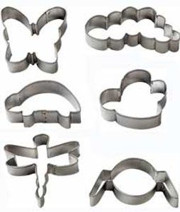 Metal Cookie Cutters. A set of 6 metal cookie cutters in fun shapes! Each cutter is approximately 3" with deep rolled edges for safe and easy use. Packages contain cookie recipe. Various themed sets available.