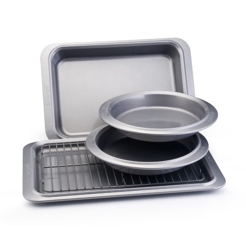 - Includes: 10"x15" Cookie Pan, 9"x13" Rectangular Cake pan, 2 - 9" Round Cake Pans, and 10"x15" Nonstick Cooling Rack- Heavier weight for improved durability - helps prevent warping