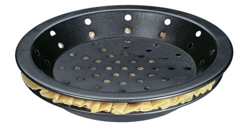 This collection features a non-stick coating, which provides quick, easy release of baked goods. These pieces are made of heavy gauge steel to prevent warping and allow even heat distribution for exceptional baking results. This pie pan comes with a perforated insert that acts as a pie crust sheild and pie weight when baking an empty shell.