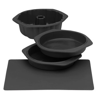 All the basic pieces for creating bakery-fresh desserts in your own home. This high-quality set is made of flexible silicone, with a non-stick, easy-to-clean surface and durability that is freezer safe, oven proof-and that you can even stick them in the microwave! Quick-release surface lets you flip cakes right out of the pan without losing a crumb; dishwasher safe for easy cleanup. Set includes two round cake pans, a baking sheet and a 12-cup fluted cake pan.