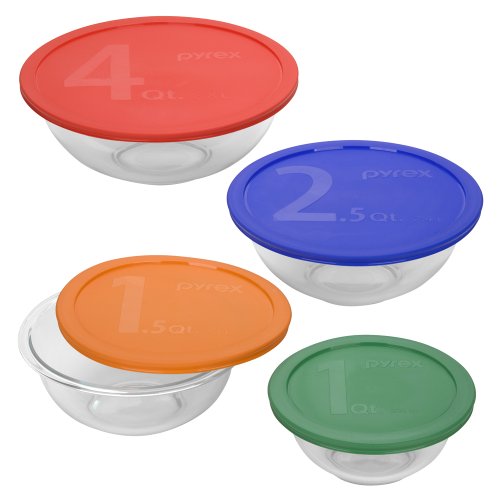 Perfect for virtually every kitchen task - cooking, serving and storage - this set of four covered bowls can go from the freezer to the oven or microwave and straight to the dinner table. Made of durable, impact resistant Pyrex with colorful, tight-fitting lids that lock in freshness. Easy to clean. Two-year warranty.