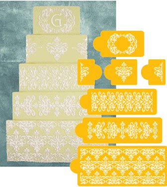 set of five tier patterns fit 6,8,10, 12, and 14 square cakes This set of five tier patterns fit 6,8,10, 12, and 14 square cakes. The bottom tier is 6 high to fit a taller tier if needed. Can be used on circular cakes as well. Layer Sizes:#1: 3.5 H x 5 W, #2: 1.5 H x 4.5 W, #3: 3 H x 10 W, #4: 3 H x 12 W, #5, 6 H, x 14 W These designs are made of 10 mil polystyrene in a one layer stencil. This Decorating Stencil can be used with royal icing, fondant, butter-cream, chocolate or any spreadable material It can also be used on top of any cake surface that isnt wet For butter-cream, make sure the surface has a dry skin or is chilled in the refrigerator and is not tacky or sticky. The best surfaces are rolled fondant, royal icing and pastiage (like rolled fondant, but sets harder). Stencils can also be used for decorations on petit fours, cookies, mints, chocolates and other confectionery items. When baking bread, use a stencil to brush on an egg wash or glaze before baking, or use as a pattern for seeds, grains or dusting powder.Ideas for using Decorating Stencils: Place Decorating Stencil directly on the top and/or sides of the iced cake surface Lay the stencil over the top of the cake and hold in place Using a polystyrene trowel, smooth a small amount of icing over the openings Gently pull off stencil Clean stencil and let icing dry To color, align the clean, dry stencil over the embossed icing and hold in place Use an air brush to apply colors, masking off the surrounding area of the cake and board to prevent overspray Dusting sugar works well with stencils too Instructions included